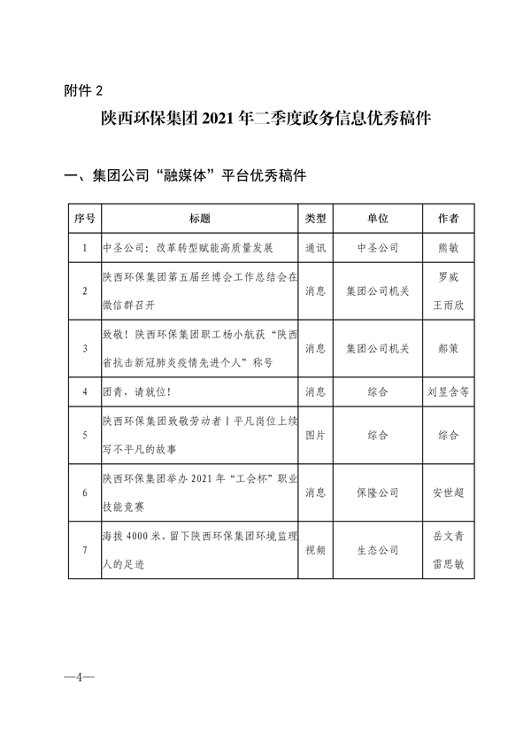 為加強(qiáng)集團(tuán)公司門戶網(wǎng)站、微信公眾號(hào)、新浪微博等“融媒體”平臺(tái)的稿件采編工作,鼓勵(lì)廣大通訊員圍繞企業(yè)中心工作撰寫出高質(zhì)量的稿件,發(fā)揮優(yōu)秀稿件的示范作用,為集團(tuán)高質(zhì)量發(fā)展鼓與呼,按照集團(tuán)公司《關(guān)于建立政務(wù)信息采用情況通報(bào)和優(yōu)秀稿件評(píng)選制度的通知》陜環(huán)司函〔2021〕31號(hào)文件要求,現(xiàn)將2021年二季度集團(tuán)公司“融媒體”平臺(tái)稿件采用及優(yōu)秀稿件評(píng)選情況通報(bào)如下: