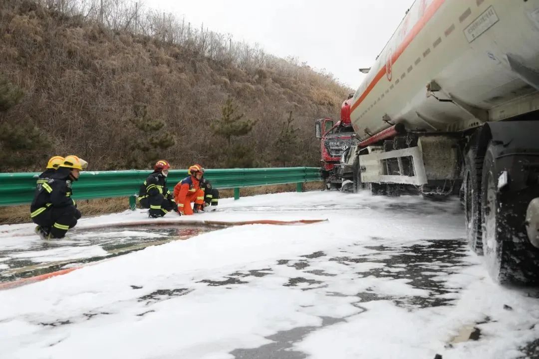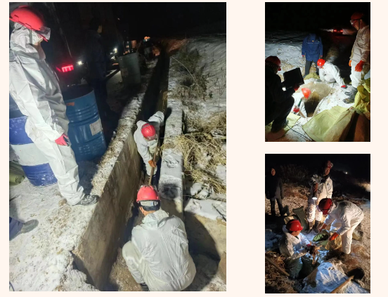 風(fēng)雪交加,國道溝深路滑,應(yīng)急救援車行駛了近7個小時后到達現(xiàn)場開展泄露污染物清理工作。由于現(xiàn)場無法使用機械設(shè)備,新天地公司應(yīng)急救援隊人員只能穿好防護服進行人工清理。零下8℃的雪天,隊員們干的大汗淋漓,人群中冒出一股股熱氣。經(jīng)過近6個小時的緊張作戰(zhàn),直至深夜,現(xiàn)場共清理污染油泥9.38噸,均運回省危廢處置中心安全處置。