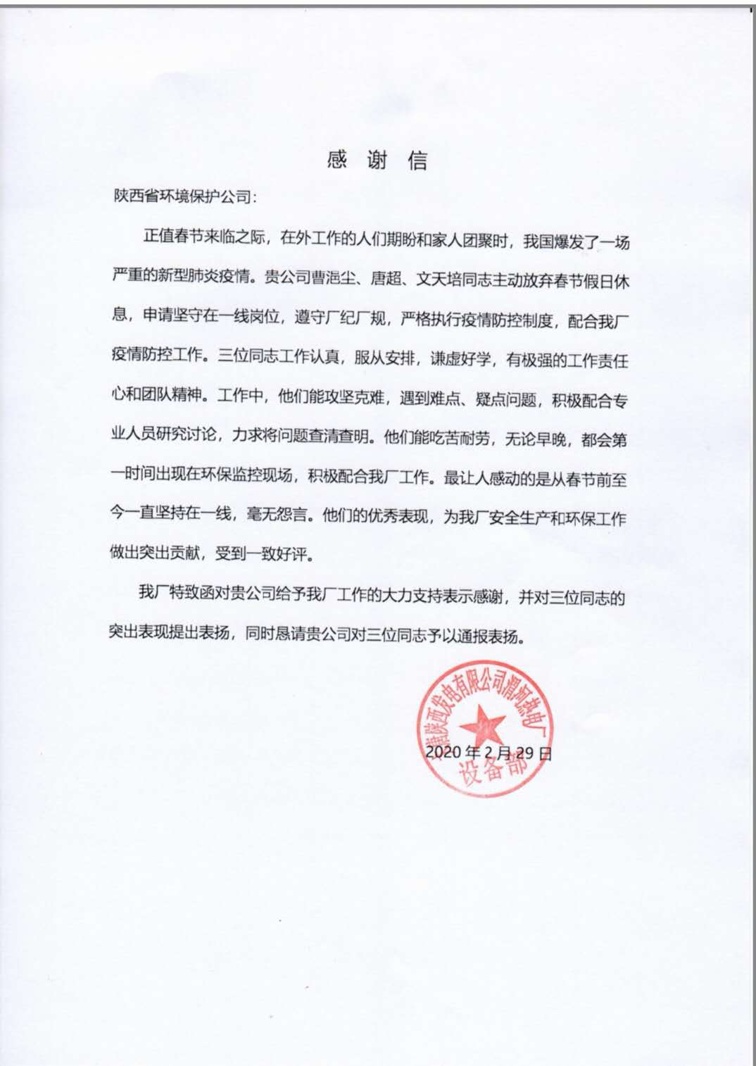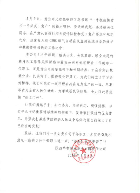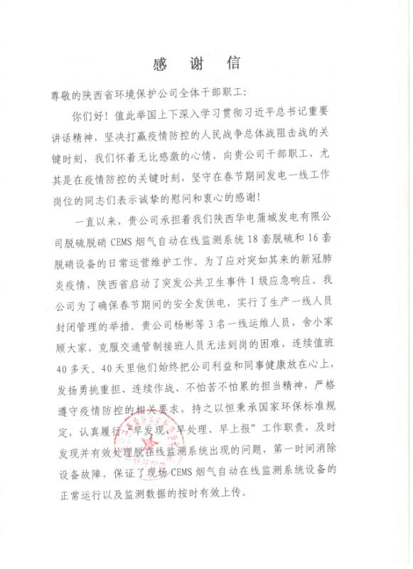 為打贏疫情防控阻擊戰(zhàn),環(huán)保公司自疫情發(fā)生以來,積極響應集團公司黨委號召,一手抓防疫,一手抓生產(chǎn),全力以赴投入到戰(zhàn)疫情、保運維的工作當中,保障了全省23家企業(yè)194套污染源在線監(jiān)測設備、30余個水質自動監(jiān)測站數(shù)據(jù)的穩(wěn)定有效上傳,同時延安甘谷驛甲醇污水處理、天藍公司延安南區(qū)供熱、垃圾填埋場滲濾液處理等民生項目安全穩(wěn)定運行,有力展示了國企擔當,履行了社會責任。連日來,陸續(xù)受到省生態(tài)環(huán)境廳、各地市生態(tài)環(huán)境局和服務企業(yè)的表揚認可。大唐陜西發(fā)電公司渭河熱電廠、陜西華電蒲城發(fā)電公司、金堆城鉬業(yè)集團等企業(yè),紛紛向環(huán)保公司發(fā)來感謝信,充分肯定環(huán)保公司運維團隊攻堅克難、團結協(xié)作、銳意進取的企業(yè)精神和想客戶之所想、急客戶所急的服務理念。