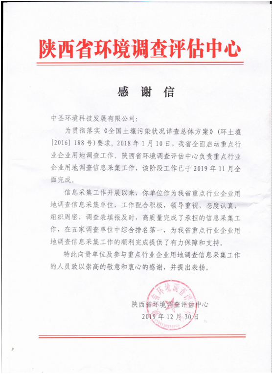 日前,中圣公司被陜西省環(huán)境調(diào)查評估中心授予“陜西省重點(diǎn)行業(yè)企業(yè)用地調(diào)查信息采集優(yōu)秀技術(shù)支撐單位”稱號。
