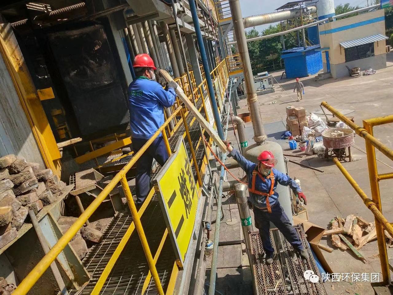 ▲2019年7月15日,楊小航(左二)生前和同事做焚燒設(shè)備點火烘爐前的準(zhǔn)備工作。
