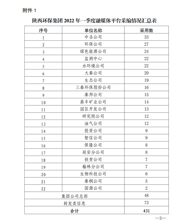 為進一步提高集團融媒體平臺稿件的質(zhì)量與水平,有效發(fā)揮融媒體平臺服務(wù)企業(yè)高質(zhì)量發(fā)展的作用,傳播時代精神,講好集團故事,按照集團公司《關(guān)于建立政務(wù)信息采用情況通報和優(yōu)秀稿件評選制度的通知》(陜環(huán)司函〔2021〕31號)文件要求,現(xiàn)將2022年一季度集團公司融媒體平臺稿件采用及優(yōu)秀稿件評選情況通報如下: