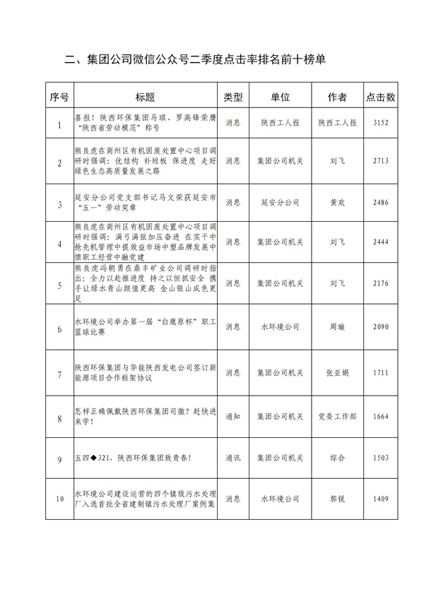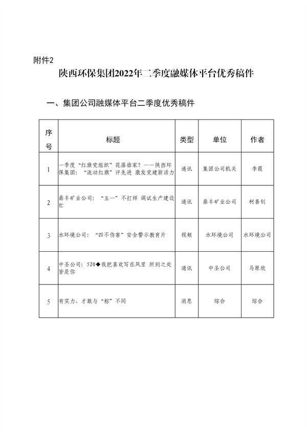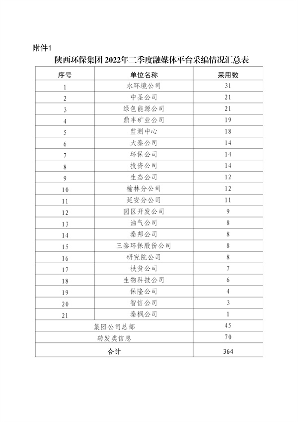 二季度集團融媒體平臺在各單位的大力支持與配合下及時有效宣傳了全集團在學習貫徹省第十四次黨代會精神、促進經(jīng)濟穩(wěn)增長、深化國資國企改革、加強創(chuàng)新合作、推進秦創(chuàng)原建設、強化黨建引領等方面取得的進展和成效,為陜西環(huán)保集團高質量發(fā)展營造了良好輿論氛圍?,F(xiàn)將2022年二季度集團公司融媒體平臺稿件采用及優(yōu)秀稿件評選情況通報如下: