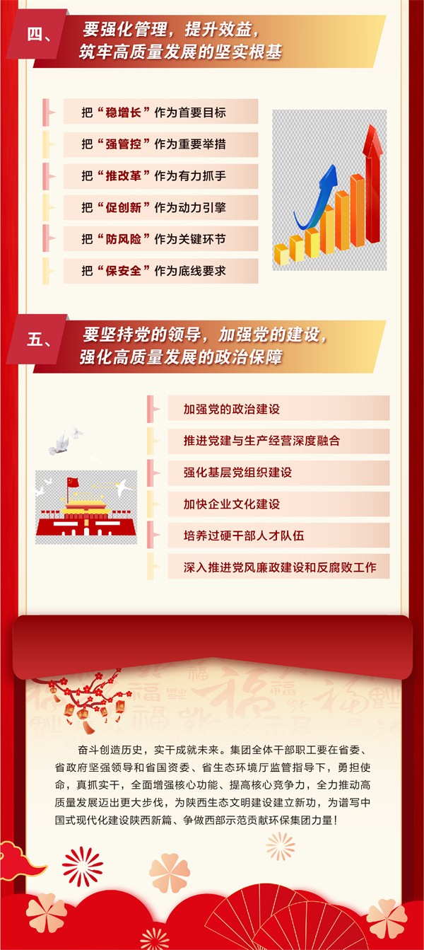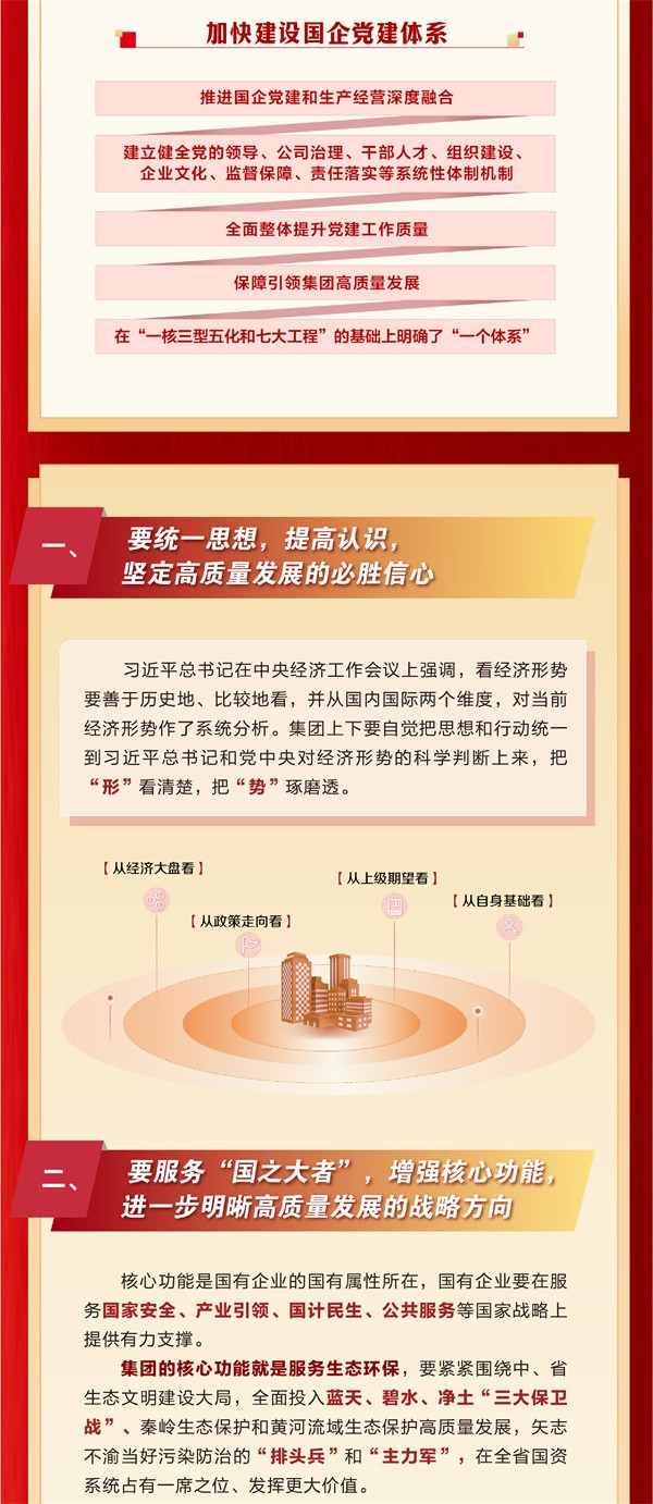 就進一步做好集團2024年工作,郝軍亮提出五個方面意見:一是統(tǒng)一思想,提高認識,堅定高質(zhì)量發(fā)展的必勝信心。要正視困難、直面問題,堅定信心、保持定力,大幅化解存量問題,有效遏制增量問題,全面提高合規(guī)管理水平,促進穩(wěn)健經(jīng)營,推動高質(zhì)量發(fā)展。二是服務“國之大者”,增強核心功能,進一步明晰高質(zhì)量發(fā)展的戰(zhàn)略方向。要聚焦“服務生態(tài)環(huán)?!边@一核心功能,緊緊圍繞中、省生態(tài)文明建設大局,全面投入藍天、碧水、凈土“三大保衛(wèi)戰(zhàn)”、秦嶺生態(tài)保護、黃河流域生態(tài)保護和高質(zhì)量發(fā)展,矢志不渝當好污染防治的“排頭兵”和“主力軍”,在全省國資系統(tǒng)占有一席之位、發(fā)揮更大價值。三是補短板、強弱項,提高核心競爭力,厚植高質(zhì)量發(fā)展的核心優(yōu)勢。要突出“科技、效率、人才、品牌、模式”五個關鍵,加快補齊短板、強化弱項、鍛造綜合優(yōu)勢,努力提升核心競爭力。四是強化管理,提升效益,筑牢高質(zhì)量發(fā)展的堅實根基。要把“穩(wěn)增長”作為首要目標,把“強管控”作為重要舉措,把“推改革”作為有力抓手,把“促創(chuàng)新”作為動力引擎,把“防風險”作為關鍵環(huán)節(jié),把“保安全”作為底線要求。五是堅持黨的領導,加強黨的建設,強化高質(zhì)量發(fā)展的政治保障。要通過加強黨的政治建設,推進黨建與生產(chǎn)經(jīng)營深度融合,強化基層黨組織建設,加快企業(yè)文化建設,培養(yǎng)過硬干部人才隊伍,深入推進黨風廉政建設和反腐敗工作等舉措,服務保障黨中央重大決策部署和省委、省政府工作要求在集團落實落地,以實干實績擁護“兩個確立”、做到“兩個維護”。