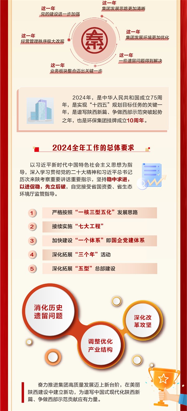 郝軍亮強調(diào),2024年是中華人民共和國成立75周年,是實現(xiàn)“十四五”規(guī)劃目標任務的關鍵一年,是譜寫陜西新篇、爭做西部示范突破起勢之年,也是環(huán)保集團掛牌成立10周年。全年工作的總體要求是:以習近平新時代中國特色社會主義思想為指導,深入學習貫徹黨的二十大精神和習近平總書記來陜考察重要講話重要指示,堅持穩(wěn)中求進,以進促穩(wěn),先立后破,自覺接受省國資委、省生態(tài)環(huán)境廳監(jiān)管指導,持續(xù)堅持“一核三型五化”,接續(xù)實施“七大工程”,加快建設國企黨建“一個體系”的“13571”發(fā)展思路,深化拓展“三個年”活動和“五型”總部建設,下大力氣消化歷史遺留問題、調(diào)整優(yōu)化產(chǎn)業(yè)結(jié)構(gòu)、深化改革攻堅,奮力推進集團高質(zhì)量發(fā)展邁上新臺階,在陜西生態(tài)文明建設中再立新功,為譜寫中國式現(xiàn)代化陜西新篇、爭做西部示范貢獻應有力量。