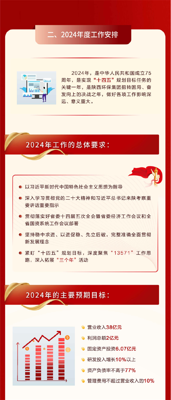 報告從“頂層設計、市場拓展、項目建設、國企改革、科技創(chuàng)新、內(nèi)部管控”六個方面全面總結(jié)2023年工作成效,客觀分析了當前存在的問題,并提出2024年工作重點:堅持穩(wěn)中求進、以進促穩(wěn)、先立后破的工作導向,深度聚焦“13571”發(fā)展思路,推動集團增強核心功能、提高核心競爭力,加快建成國內(nèi)一流環(huán)保企業(yè),為改善區(qū)域生態(tài)環(huán)境、助推環(huán)保產(chǎn)業(yè)發(fā)展、譜寫中國式現(xiàn)代化建設的陜西新篇章作出更大貢獻。2024年主要經(jīng)營目標是:全年實現(xiàn)營業(yè)收入38億元,利潤總額2億元,固定資產(chǎn)投資6.07億元,研發(fā)投入增長10%以上,資產(chǎn)負債率不高于77%,管理費用不超過營業(yè)收入的10%。