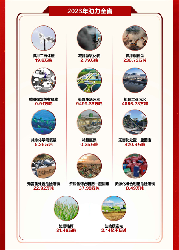全年助力全省減排二氧化硫19.8萬噸、氮氧化物2.79萬噸、煙粉塵236.73萬噸、揮發(fā)性有機物0.91萬噸;處理生活污水9499.36萬噸、工業(yè)污水4856.23萬噸,減排化學需氧量5.26萬噸、氨氮0.25萬噸;無害化處置一般固廢420.9萬噸、危險廢物22.92萬噸;資源化綜合利用一般固廢37.98萬噸、危險廢物0.49萬噸;處理秸稈31.46萬噸,生物質(zhì)發(fā)電2.13億千瓦時,為全省打贏污染防治攻堅戰(zhàn)發(fā)揮了“排頭兵”“主力軍”作用。
