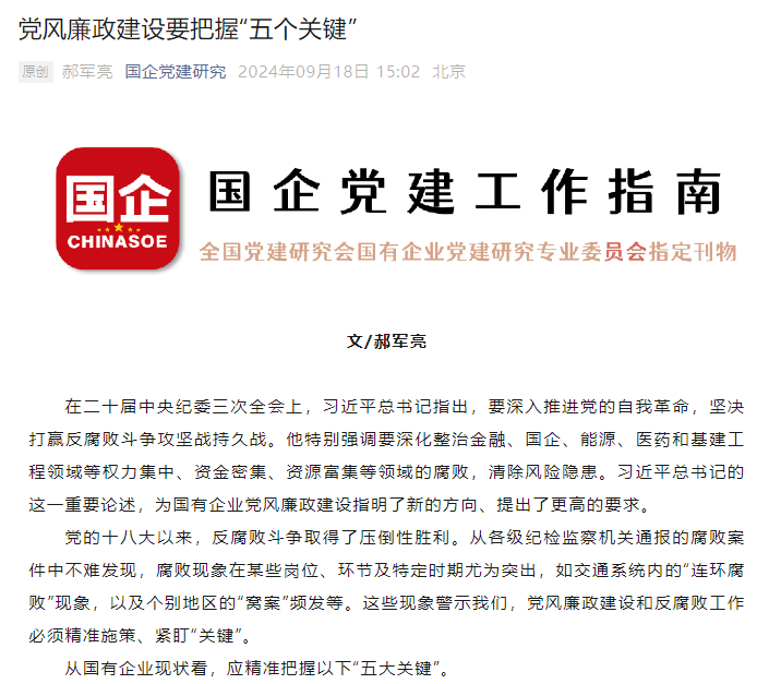 日前出版的《國企》雜志刊發(fā)了陜西環(huán)保集團黨委書記、董事長郝軍亮同志文章《黨風廉政建設(shè)要把握“五個關(guān)鍵”》。現(xiàn)刊載如下,以饗讀者。