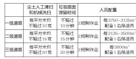 標準提到,西安市道路清掃保潔等級劃分為一級、二級、三級道路。道路清掃保潔質(zhì)量應達到“道牙無塵,路無雜物,設施整潔,路見本色”的質(zhì)量標準。鐘鼓樓廣場、東南西北大街、省委周邊道路、大雁塔廣場和周邊道路、新城廣場周邊道路、張家堡廣場和周邊道路等重點區(qū)域地面塵土,人工清掃每平方米不超過5克,垃圾路面滯留時間不超過5分鐘;保潔員人員配備上,上述重點地區(qū)按三班制作業(yè),每2750平方米配備一名保潔員(一、二、三級道路作業(yè)標準見表格)。